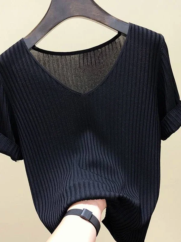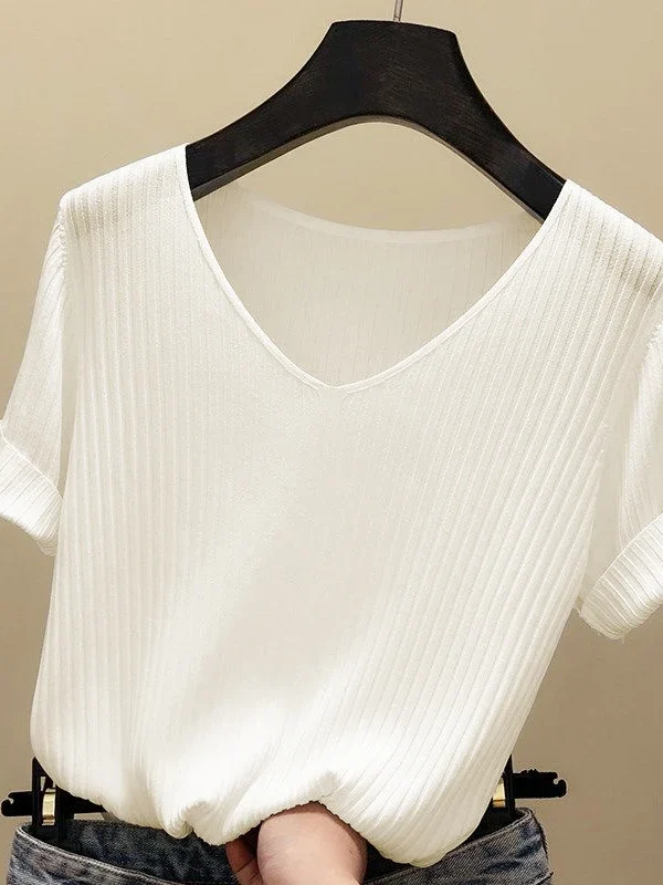 2025 Female Thin Knitted Ribbed Sweater Women Basic V-neck Solid Thin Summer Pullover Slim Short Sleeve Bodycon Sweater