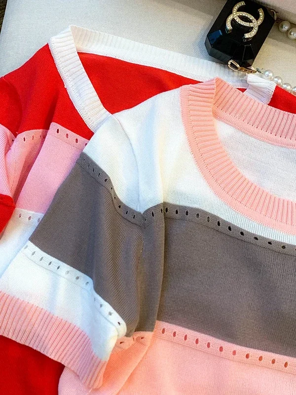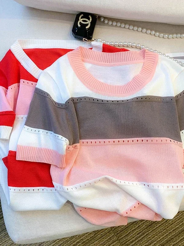 2026 New Strip Rainbow Hollow Out Crew Neck Pullover Sweater Versatile Short Sleeve Knitted Top For Spring & Women’s Clothing