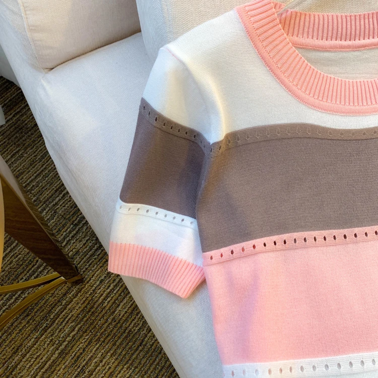 2026 New Strip Rainbow Hollow Out Crew Neck Pullover Sweater Versatile Short Sleeve Knitted Top For Spring & Women’s Clothing