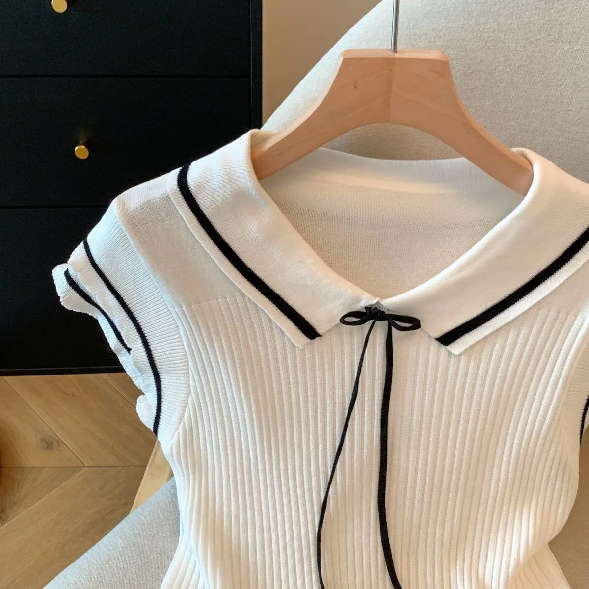 2026 New Summer Turndown Collar Double-layer Flying Sleeve Knitted Pullovers Lace Up Bow Solid Color Pullovers Tops