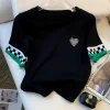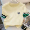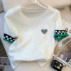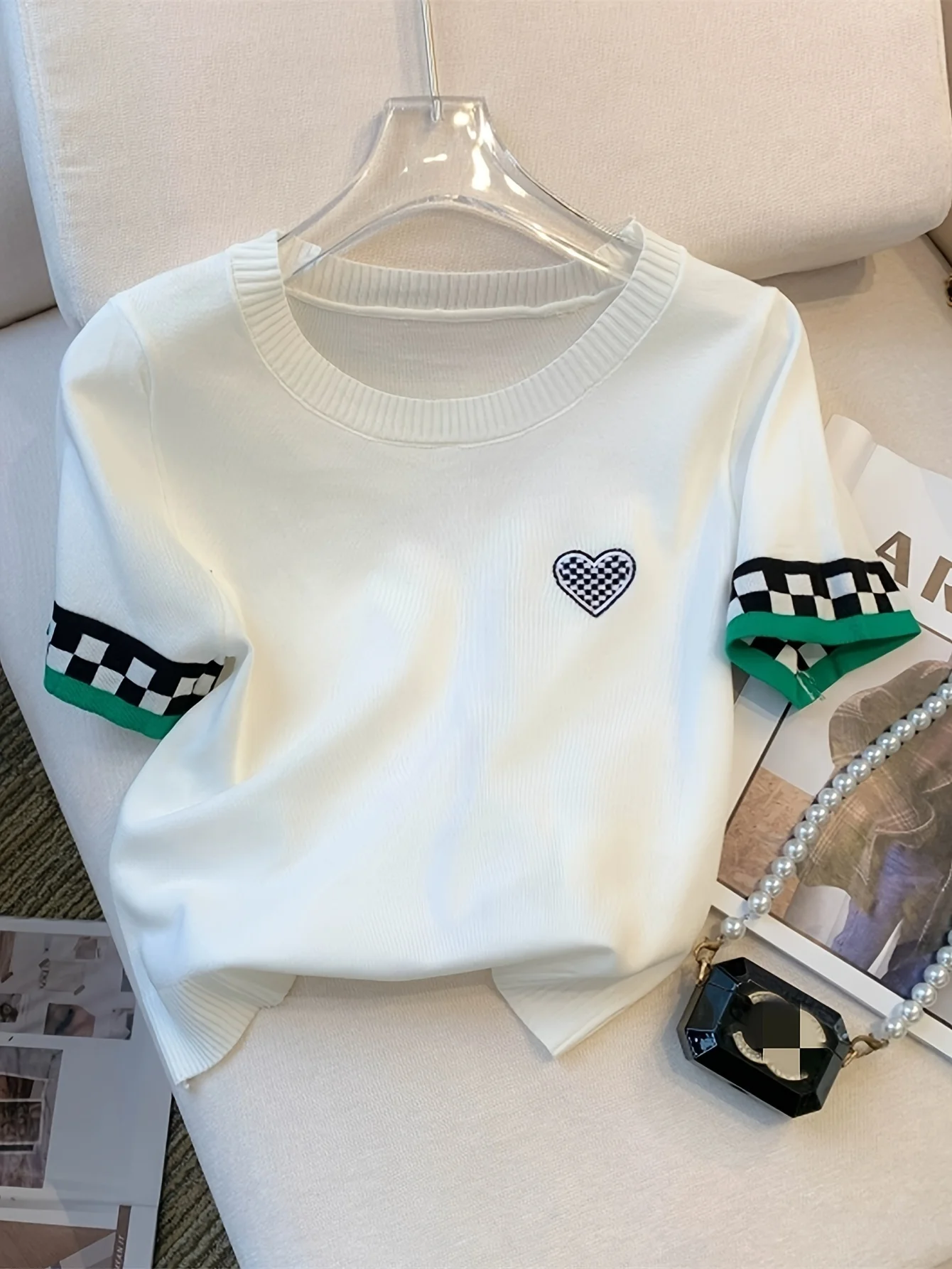 New Summer Heart Pattern Ribbed Pullover Sweater Casual Contrast Trim Crew Neck Short Sleeve Sweater Women’s Clothing Crop Top