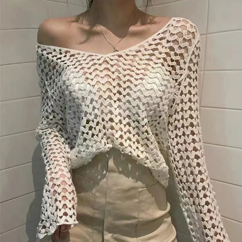 Sheer Crochet Top Long Sleeve Heart Embroidery Openwork Knitted Blouse Pullovers Women Summer Boho Vacation Beach Outfit